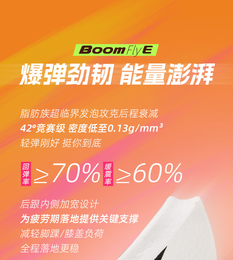 Midsole: BoomFly E Aliphatic E-TPU Supercritical Foam