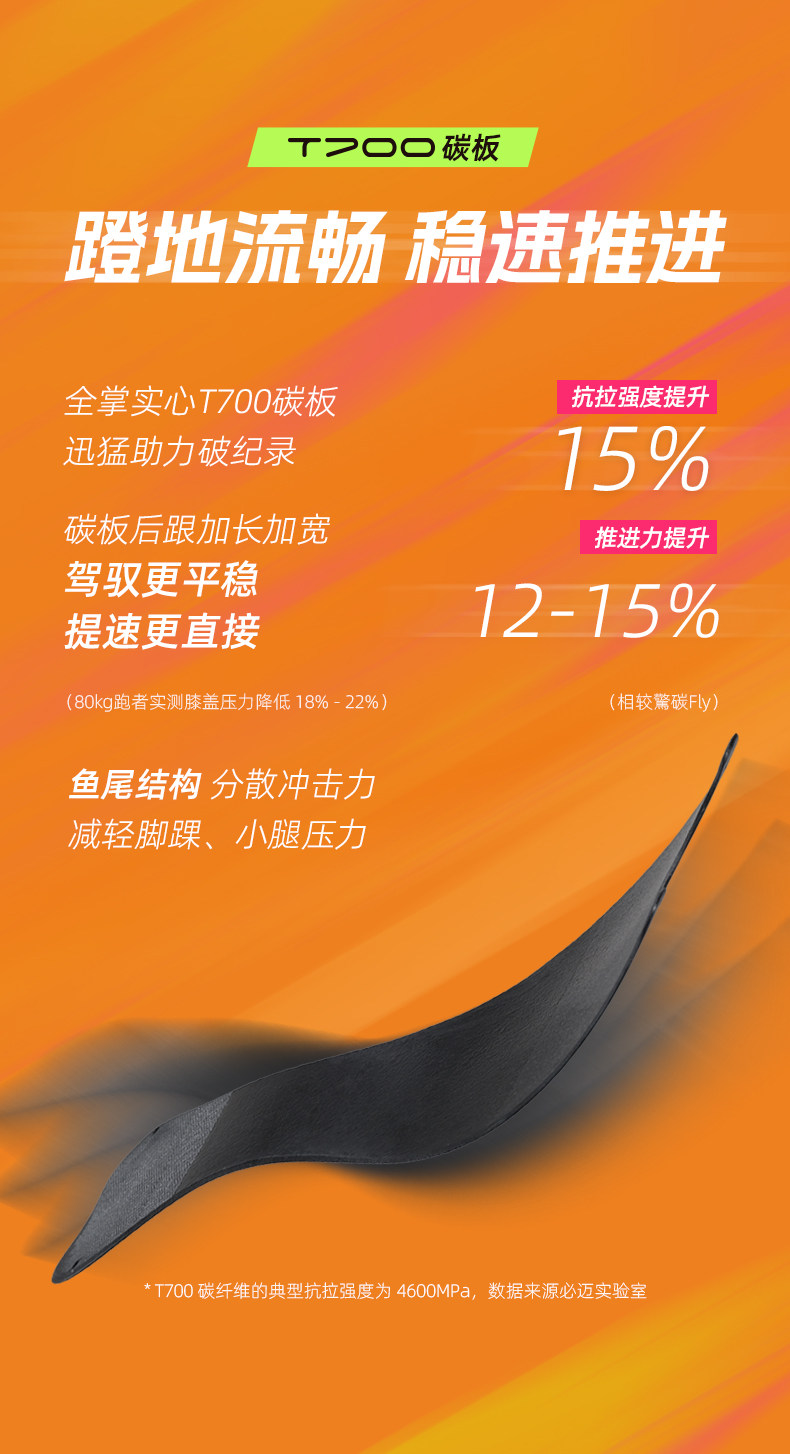 T700 Full-Length Carbon Plate: The reinforced fish-tail shaped T700 carbon plate provides targeted rigidity. It offers a powerful lever effect and aggressive toe-off, particularly noticeable when pushing paces faster than 4:30/km.