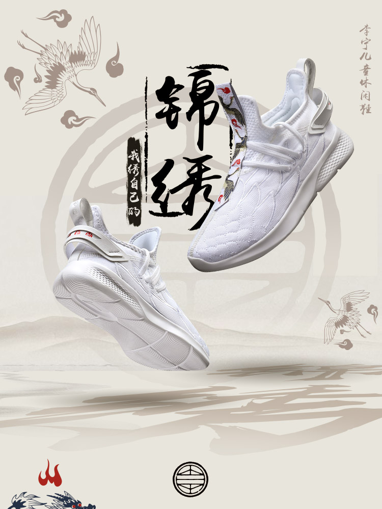 Following adult version of Pens & Swords(文武双全), Li-Ning introduced the kids version to Couterflow line. The white pair stands for bright, which resemble the step on palace. The traditional embroidery shows great future of pens and swords. The black pair stands for soul, which resemble the ancient book and sword. It match closely with Chinese spirit.