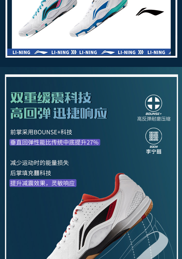 Tech: Li Ning Bounse; Non-Marking; Li Ning Boom; Li Ning Cloud