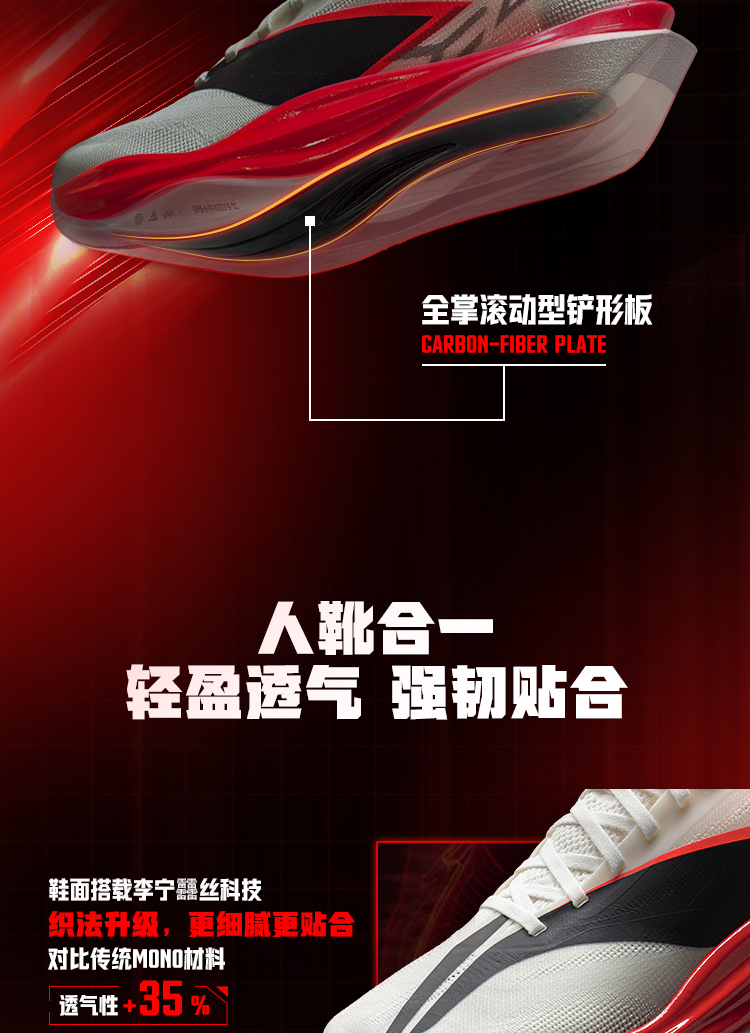 * Carbon Plate Structure: Features a T1000 Ejection-Type Carbon Plate paired with a dual-bow structure, enabling powerful energy storage and explosive release for a fierce push-off feel.