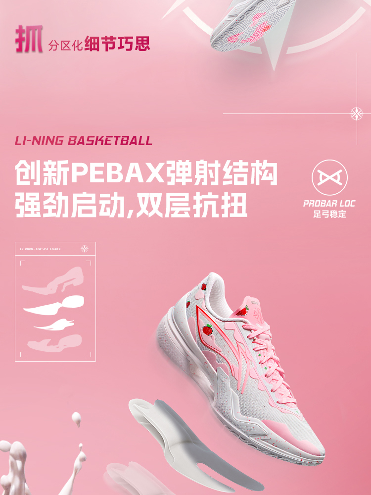 The Li-Ning Liren 5 - Strawberry Milkshake draws inspiration from the delightful combination of sweetness and freshness, much like a strawberry milkshake. This shoe features a playful and vibrant color scheme that captures the essence of this popular treat, blending white with shades of pink and red to create a visually appealing design that's both stylish and sporty.
