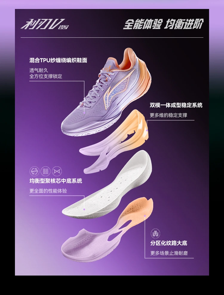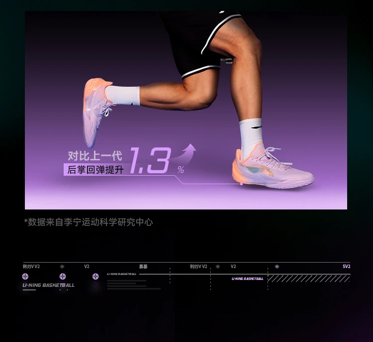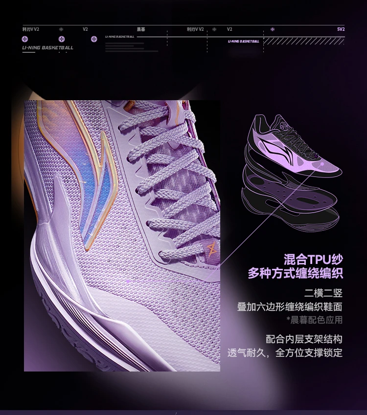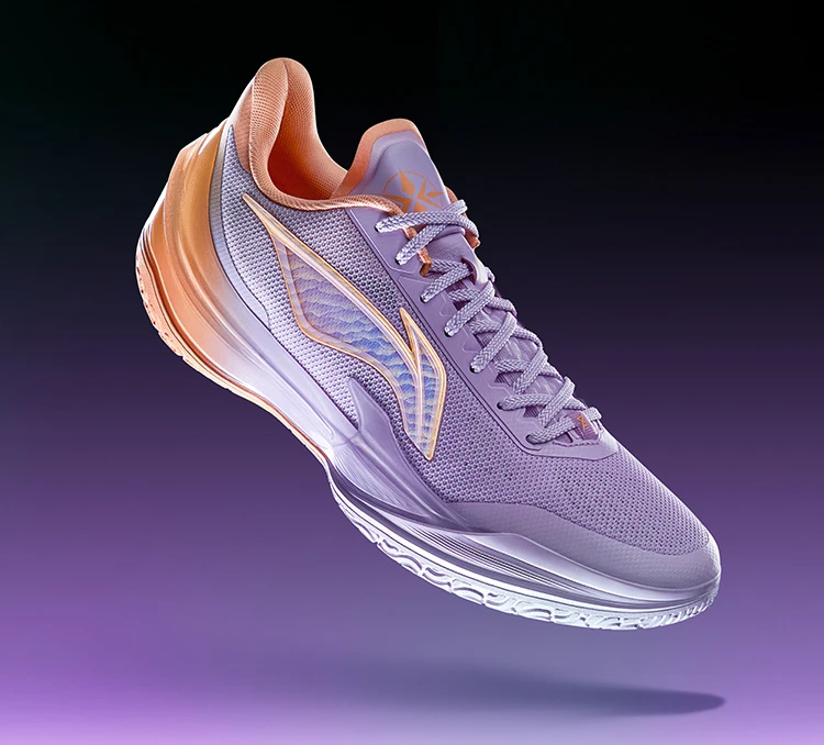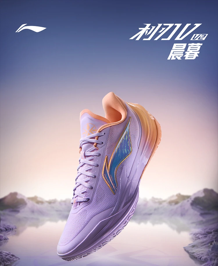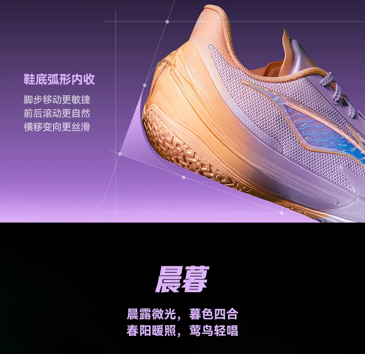 The Li Ning Liren 5 V2 Dawn and Dusk theme has a purple gradient that mimics a morning-evening light gradient. Its low - cut design and iridescent tongue and heel enhance its visual layers.