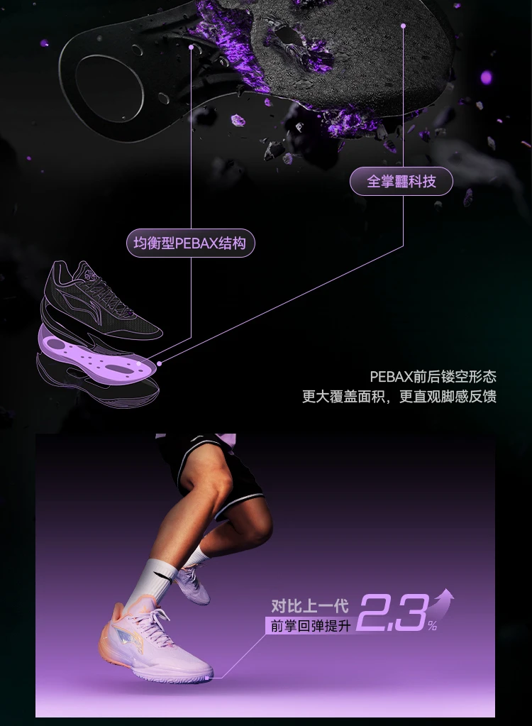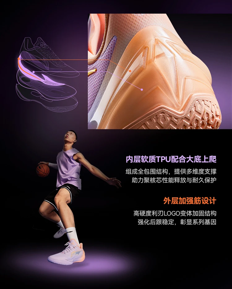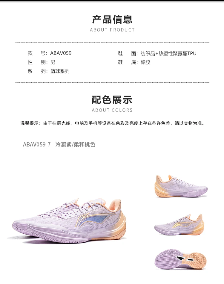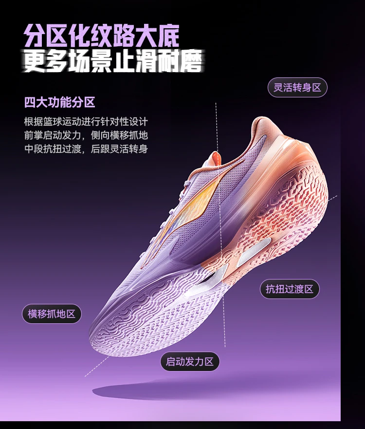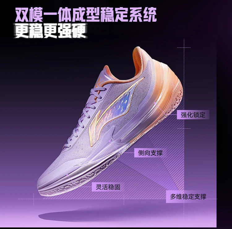 The Li Ning Liren 5 V2 Dawn and Dusk theme has a purple gradient that mimics a morning-evening light gradient. Its low - cut design and iridescent tongue and heel enhance its visual layers.