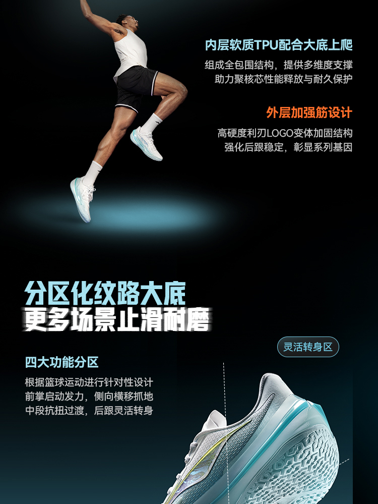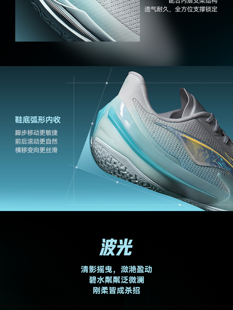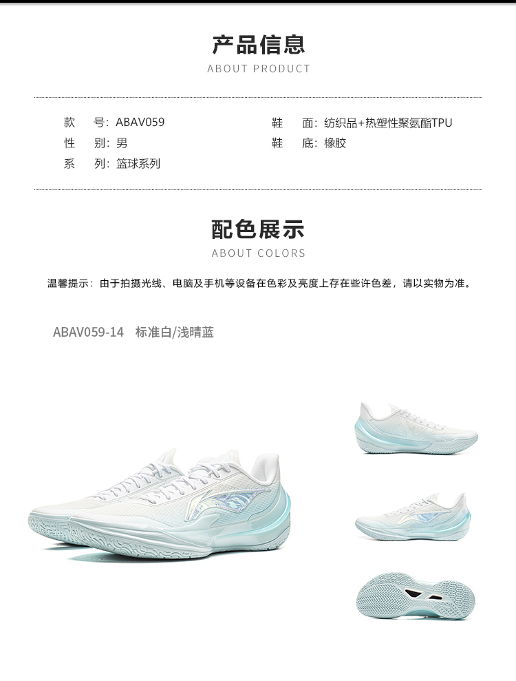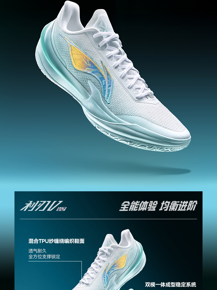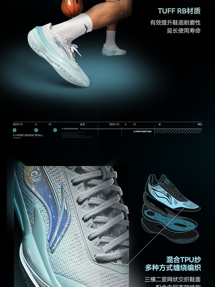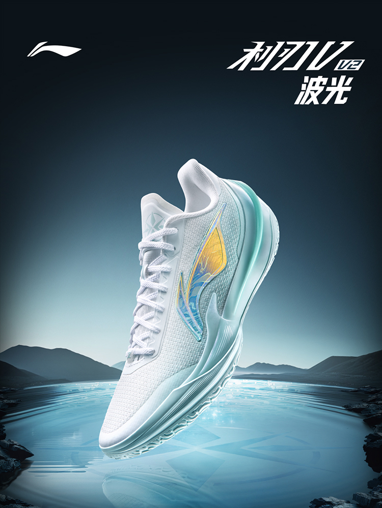 The Li Ning Liren 5V2 "Rippling Light" colorway features a clean Standard White/Light Sky Blue design, with a shimmering "ripple" effect on the side logo, creating a fresh and vibrant aesthetic. Designed for summer wear, the shoe prioritizes breathability through its mesh upper and maintains the series' signature low-top silhouette.