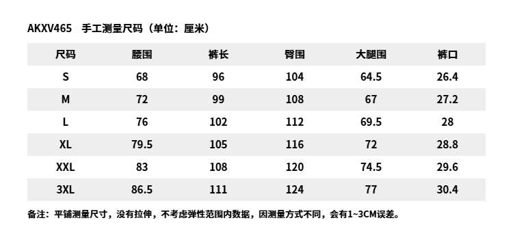 Size Waist (cm) Pants Length (cm) Hip Circumference (cm) Thigh Circumference (cm) Ankle Opening (cm)