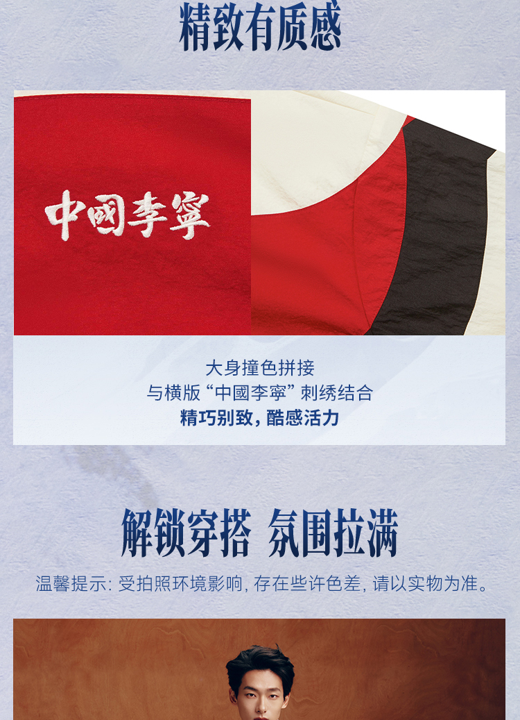 * Embroidered horizontal "Li-Ning China" logo on the front, paired with color-block accents for iconic brand recognition;
