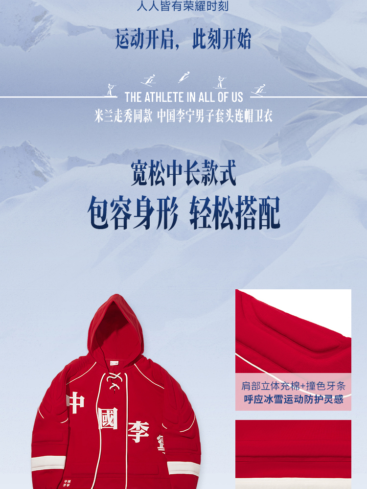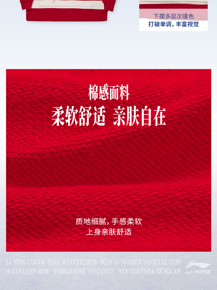 As featured on Li-Ning’s 2026 Fall/Winter Milan Fashion Week runway (January 16, 6 PM CET, Padiglione Visconti, Via Tortona 58 Milan), this unisex hoodie (designed with a men’s relaxed fit) embodies the collection’s theme "THE ATHLETE IN ALL OF US"—merging winter sports inspiration with high-fashion comfort.