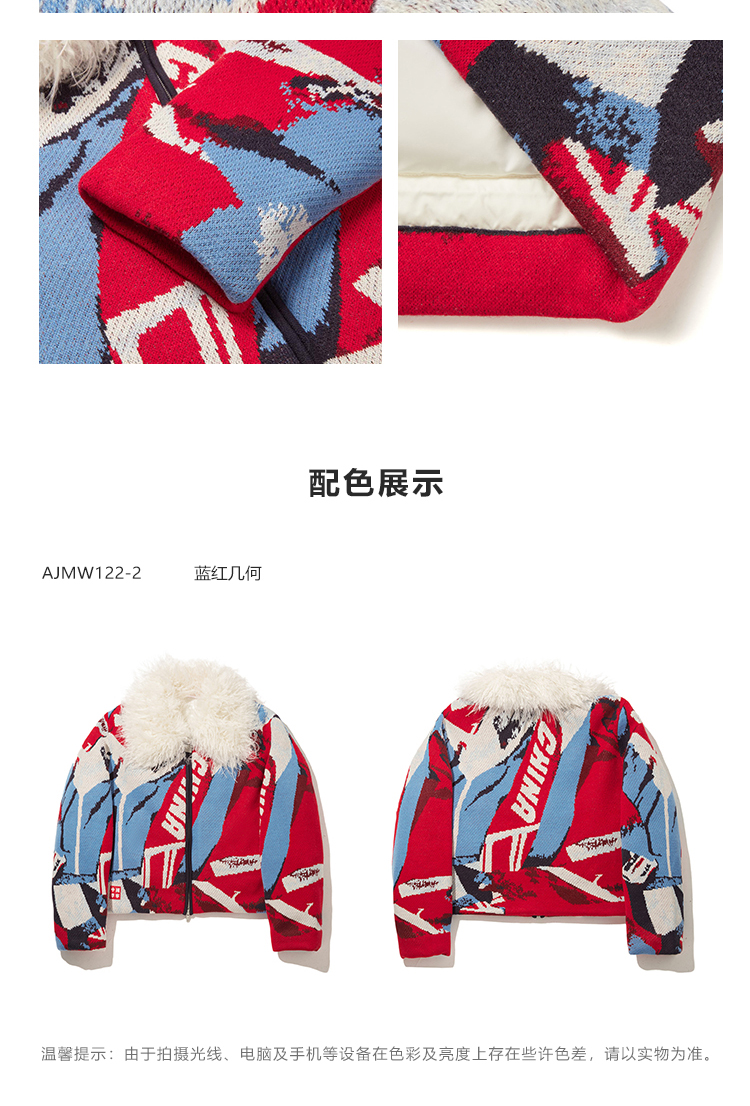 Ideal for winter city commutes, casual outings, or weekend gatherings—pair with jeans, leggings, or dresses for a polished yet playful look. The blue-red geometric print adds a trendy pop of color, while the loose fit and faux fur collar blend comfort with runway-inspired style.