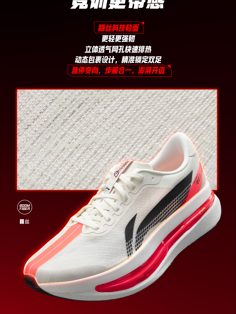 Lightweight, tear-resistant Boom Silk upper with 3D breathable mesh vents enables rapid heat dissipation and air circulation, keeping feet cool and dry during long runs. A dynamic wrap design with a refined heel lock system precisely secures the foot, eliminating slippage during quick movements while balancing a snug fit with lightweight breathability.
