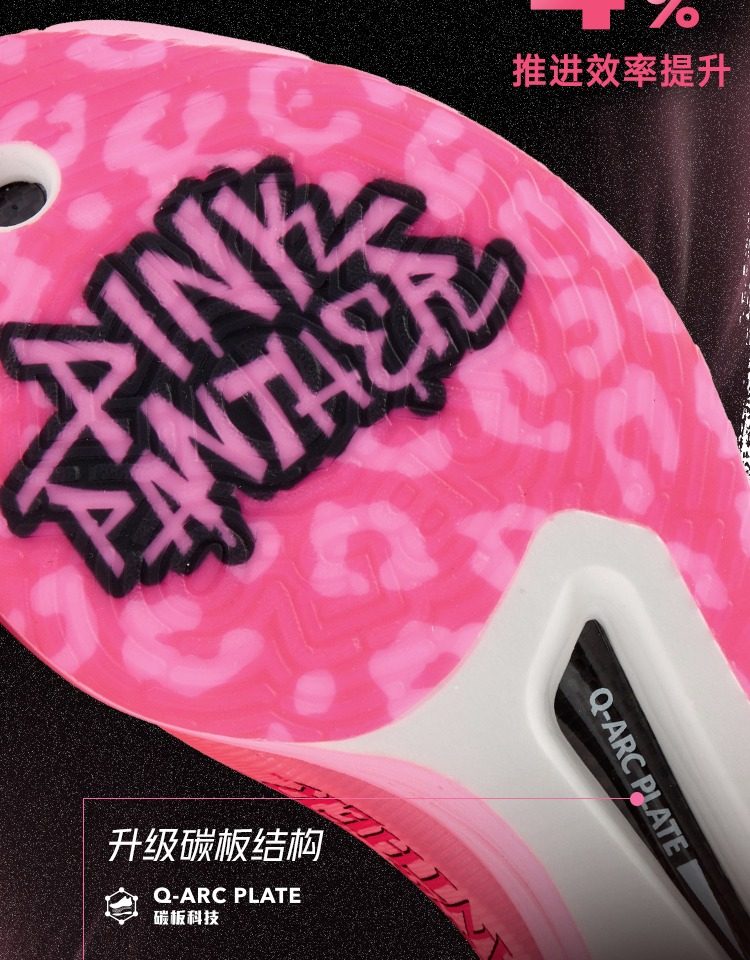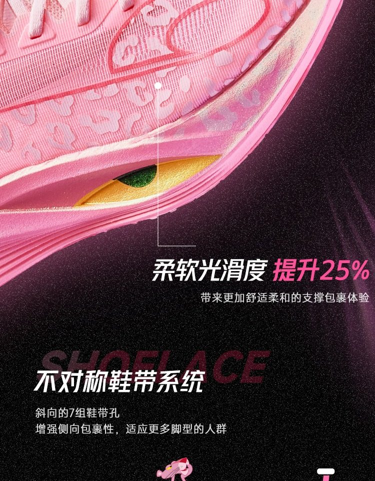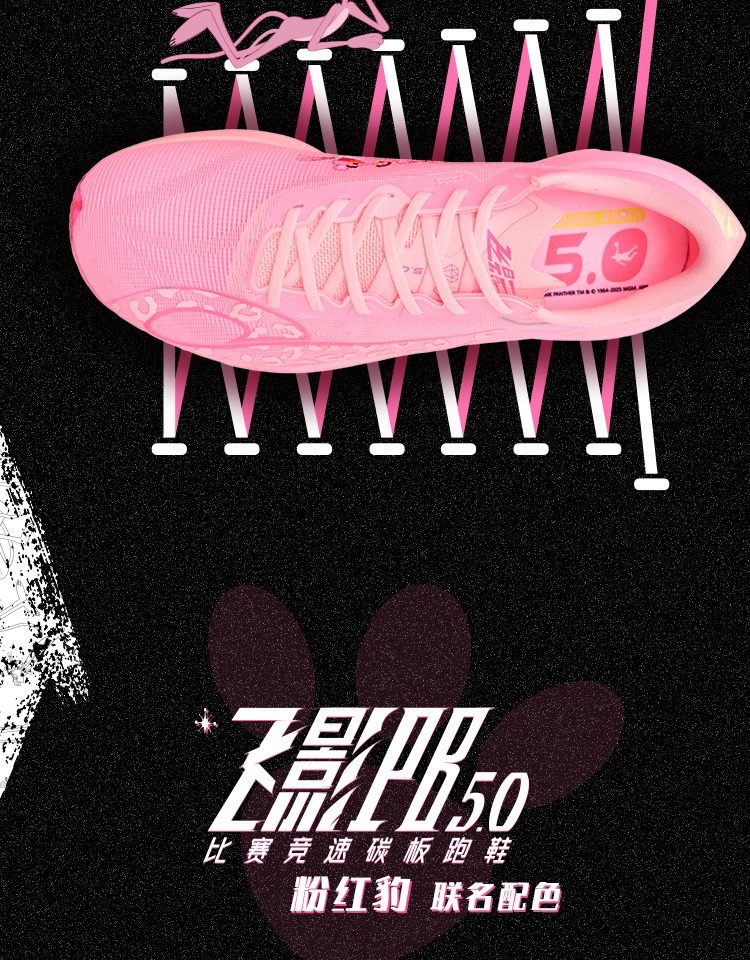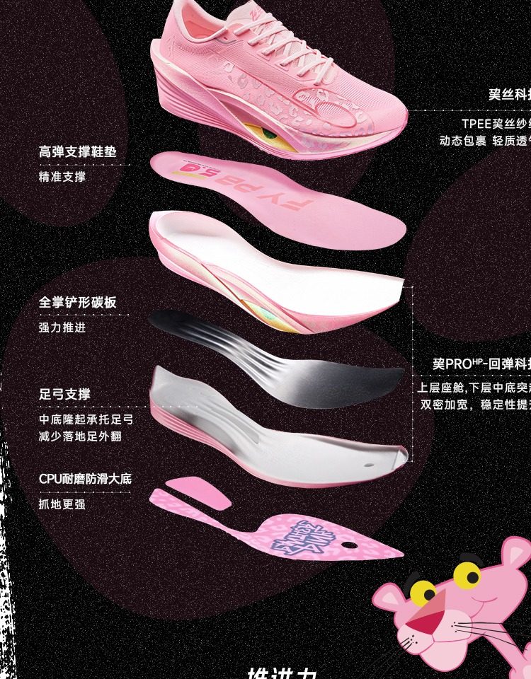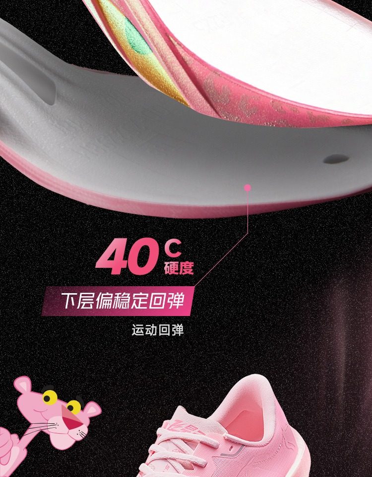 * Core Theme: Leap Like a Panther – the design captures the Pink Panther's iconic playful yet fierce spirit, combining the IP's signature pink hue with classic leopard print to break the monotony of traditional racing shoes.