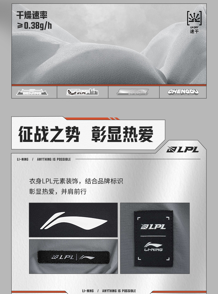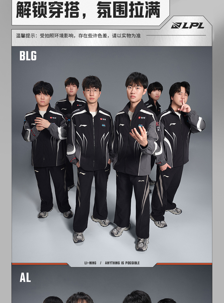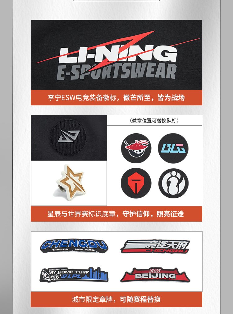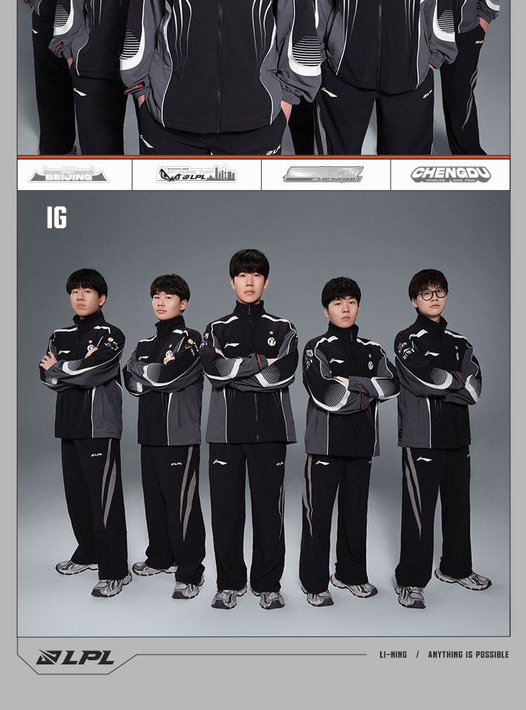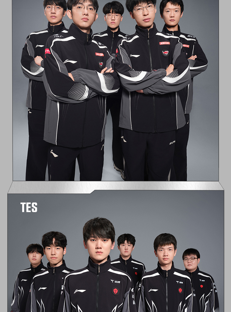 * Collar & Cuff Design: The stand-up collar draws inspiration from traditional Chinese clothing, symbolizing the teams’ spirit of “leading with wisdom, acting with strategy”. The cuffs hide exclusive patterns of each team — TES’s “flowing cloud & water” pattern echoes its aggressive team-fight style; BLG’s “Dunhuang Flying Apsaras” pattern highlights its championship heritage; IG’s “ink wash sword” pattern pays tribute to its “sharp blade breaking through” tradition; TOP’s “mountains & rivers” pattern represents its steady and powerful rise as a new force in LPL.