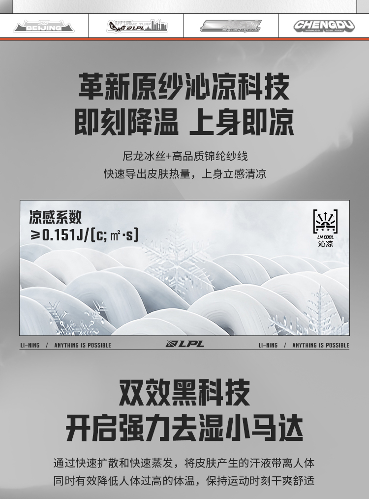 * Cool & Quick-Dry Core: Made of AT DRY Freeze ice-feel yarn, it cools the skin by 2-3℃ instantly upon contact. Even when worn for a long time in enclosed esports venues, it quickly wicks away sweat — ideal for players’ long training sessions and matches.