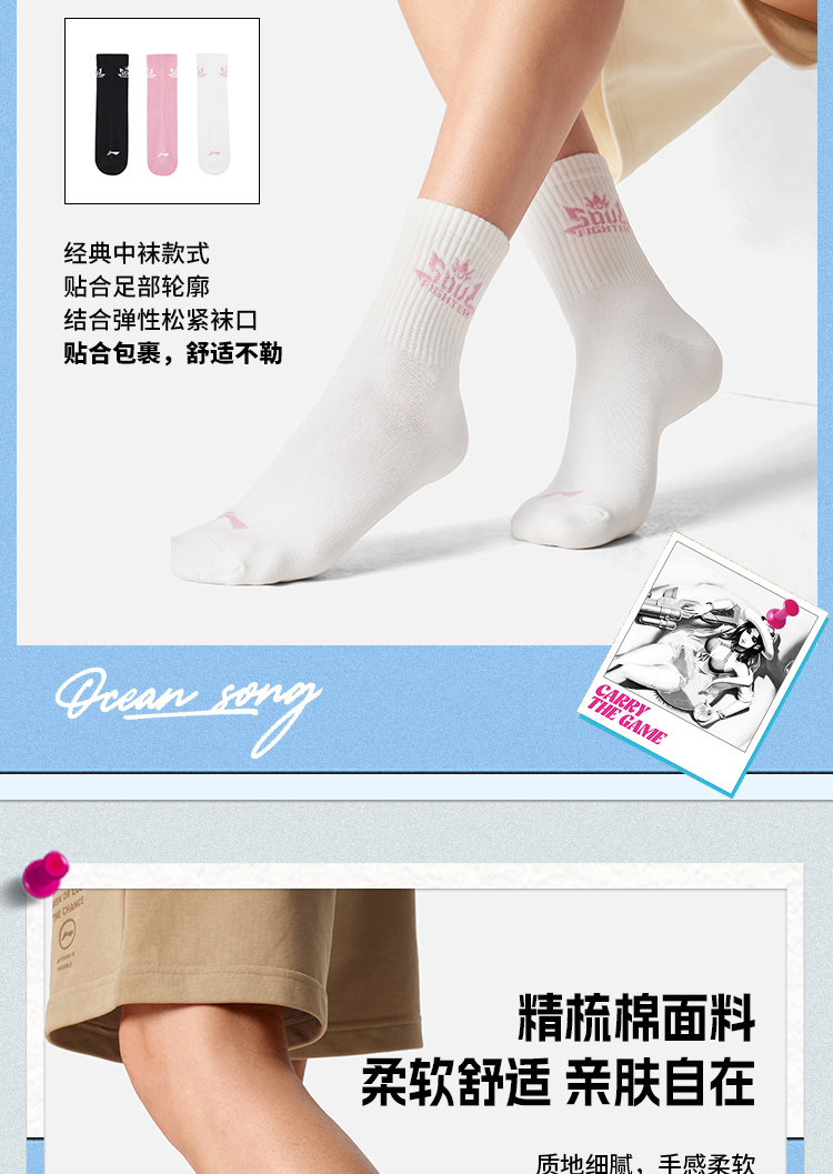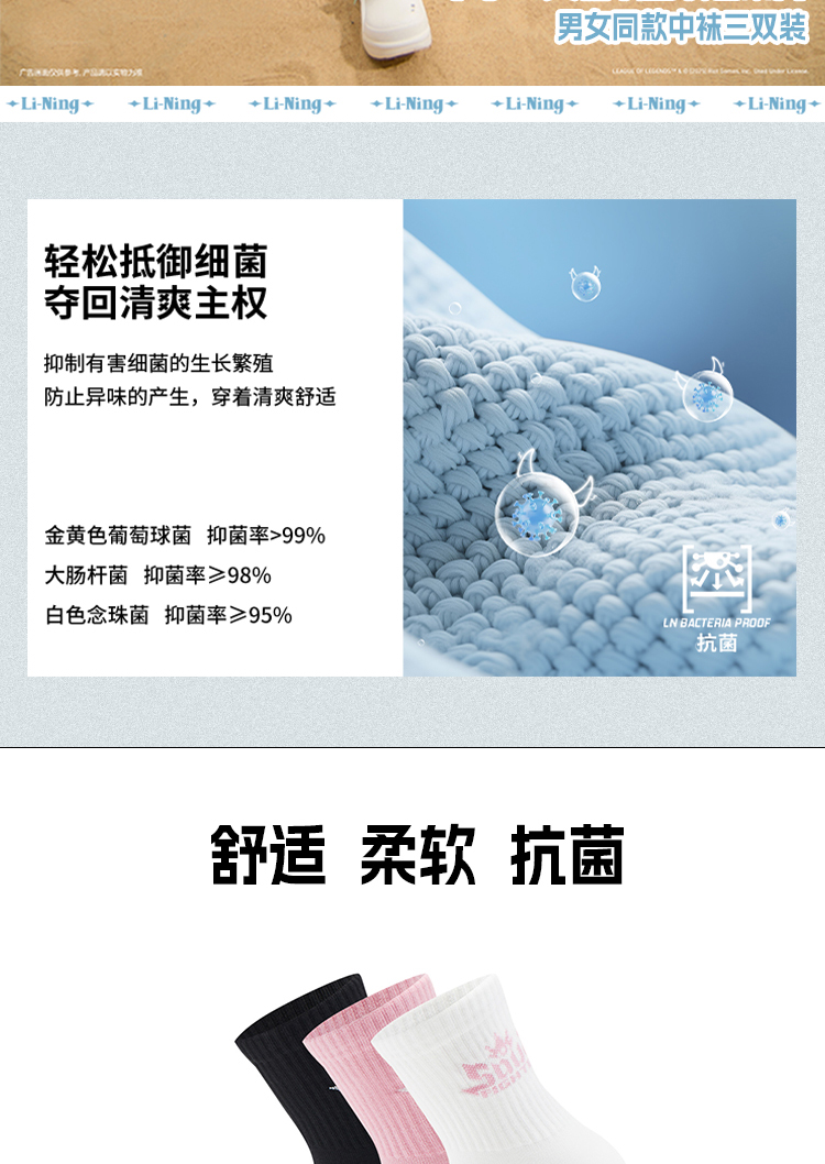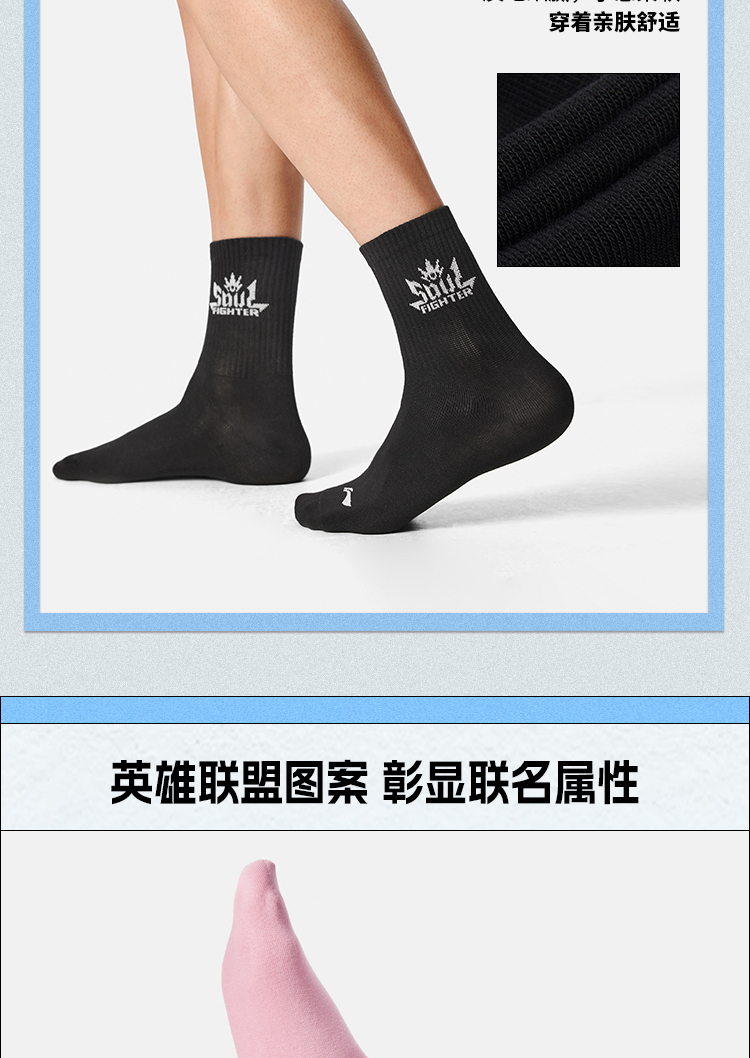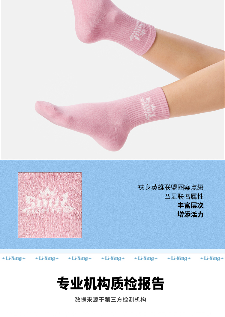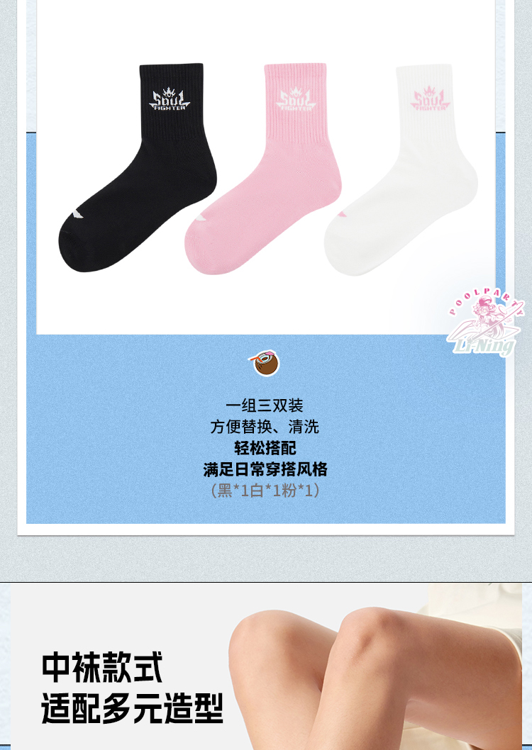 As a functional and stylish staple in the LI-NING x LPL "Soul Fighter" collaboration, this 3-pair pack of crew socks merges esports fandom with daily comfort and antibacterial technology. Designed for global League of Legends Pro League (LPL) fans, it features "Soul Fighter"-inspired graphics, soft combed cotton fabric, and LI-NING’s proprietary antibacterial tech—perfect for daily wear, gaming marathons, or light sports. The versatile 3-color set (black, white, pink) ensures easy matching with sneakers, casual shoes, or LPL-themed apparel, making it a must-have for fans seeking both style and practicality.
