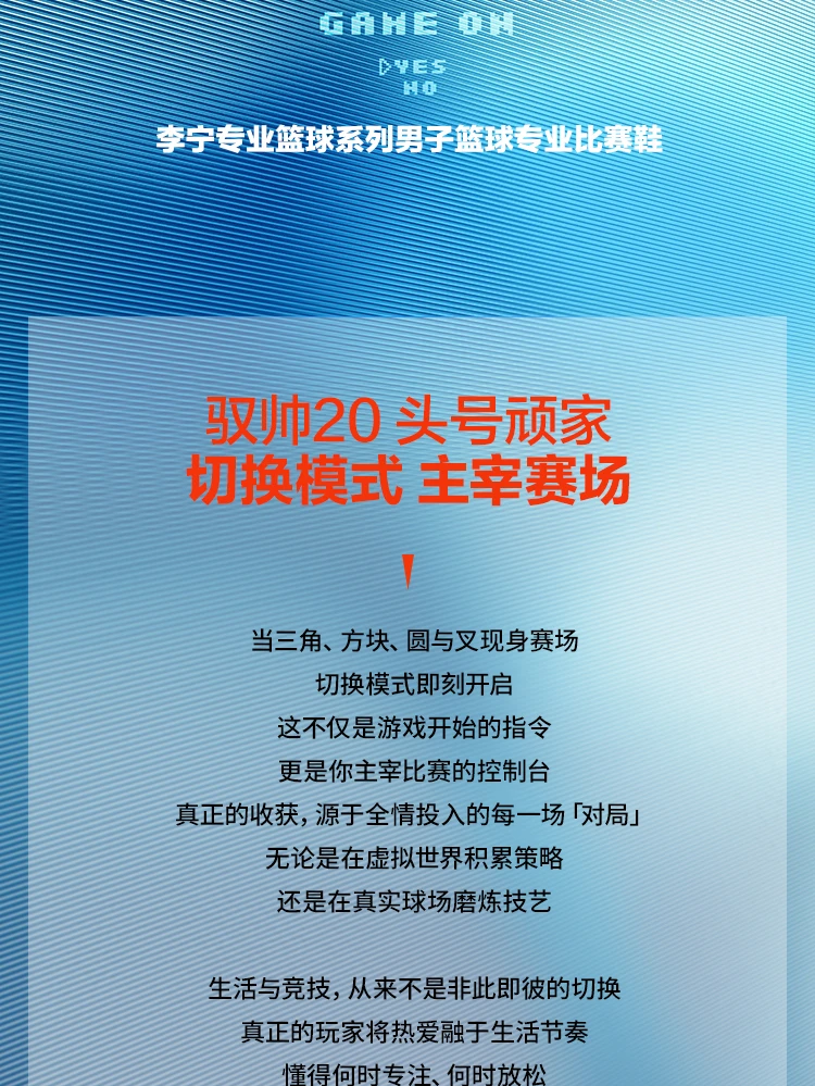 The Li-Ning Yushuai 20 "Top Gamer" is built for the modern athlete who refuses to choose between competition and life. Centered on the powerful mantra "Switch Modes, Dominate the Court", this shoe redefines versatility: it delivers pro-level performance for intense basketball competition, while offering street-ready style for everyday wear, breaking the traditional line between sport and lifestyle.
