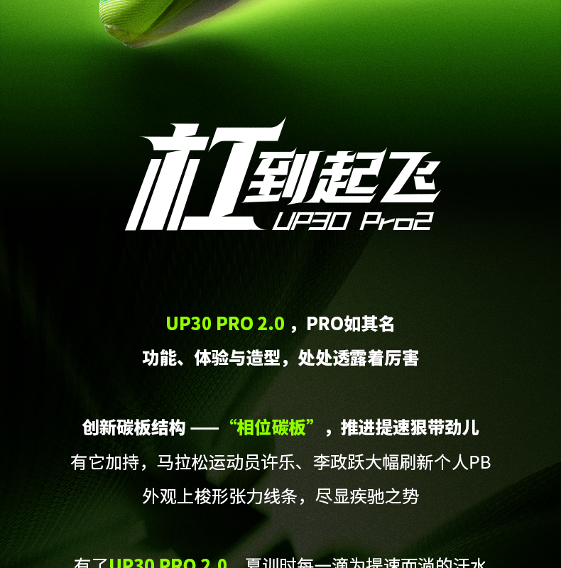 Crafted for runners seeking both speed and comfort, it features a triple-layer midsole system that balances responsive bounce, shock absorption, and energy efficiency—perfect for marathon races, tempo training, and 10-20km high-intensity sessions. With an 86% energy return rate, 6mm drop, and lightweight design (244g for US8.5), it’s accessible to intermediate runners yet capable of supporting elite-level pace goals. Whether you’re chasing a personal best or elevating your training, the UP30 PRO 2.0 is your ultimate race-day and speed-work companion.
