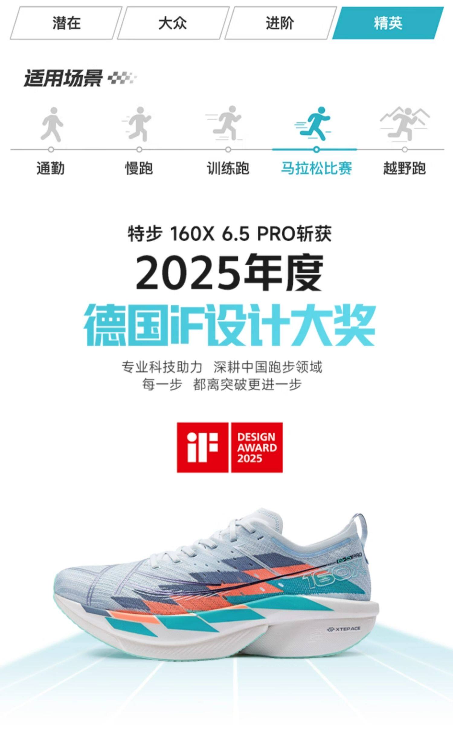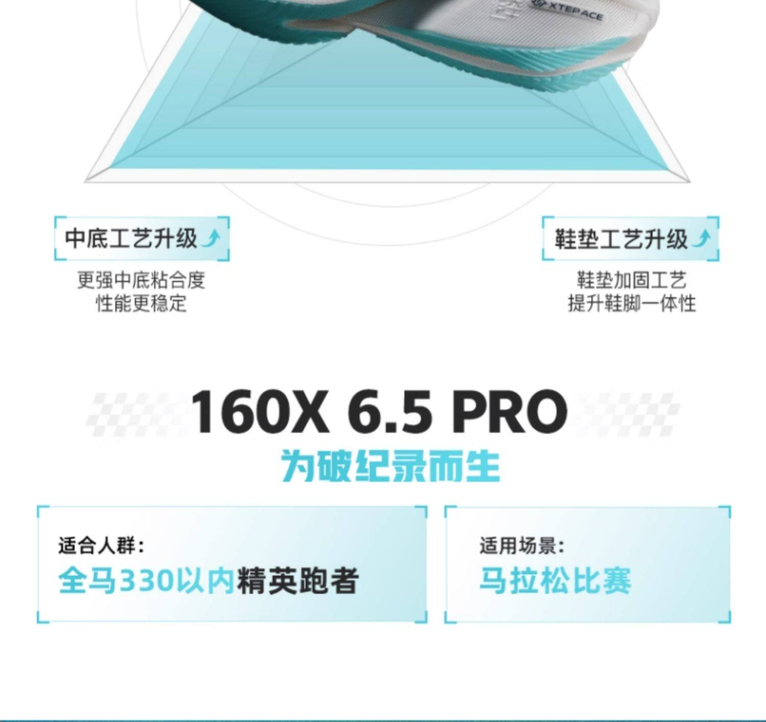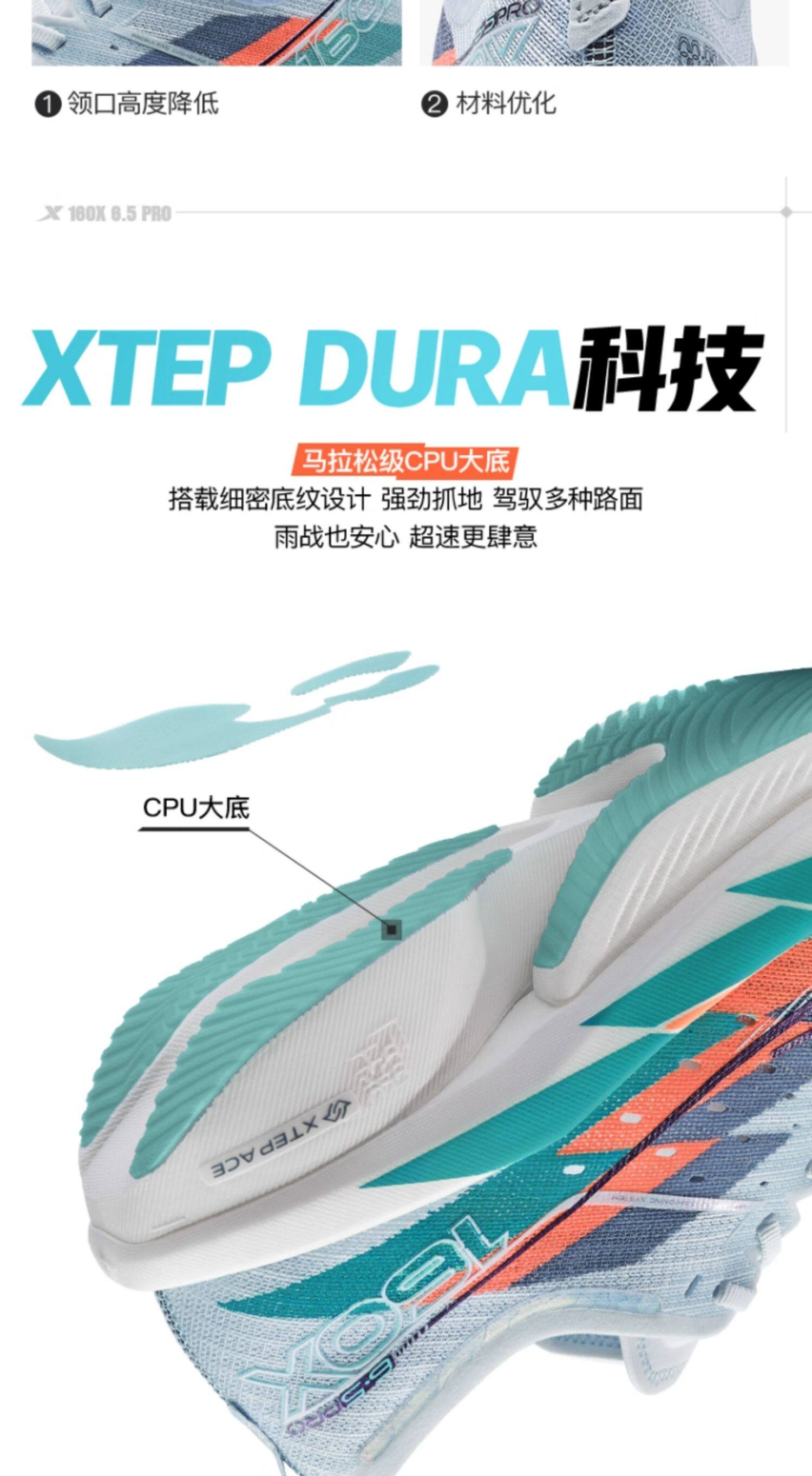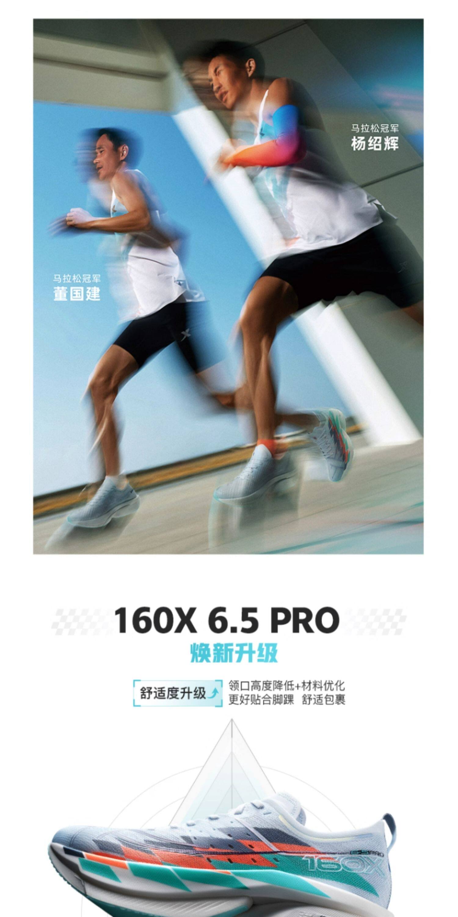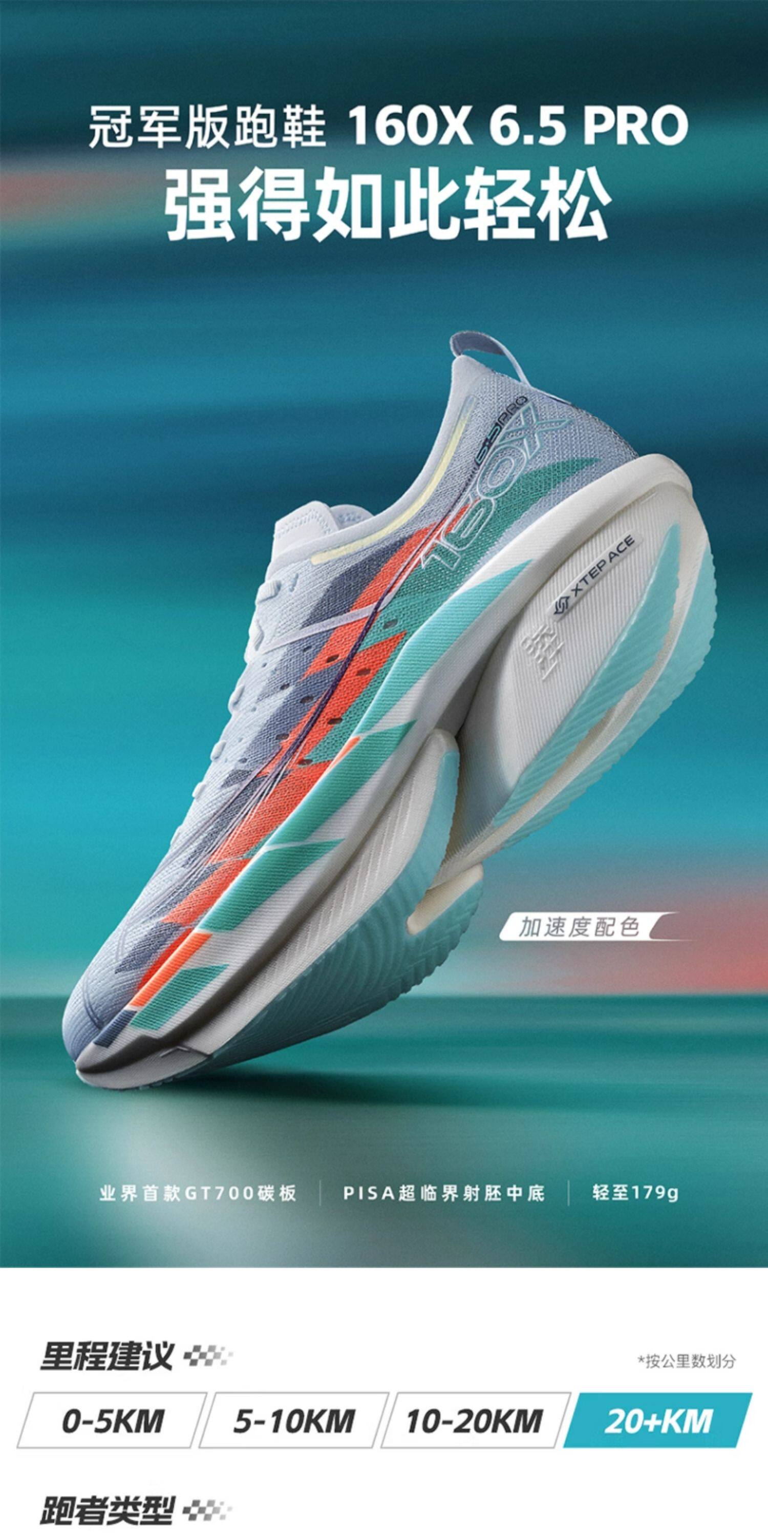 XTEP 160X 6.5 PRO is a 2025 upgraded flagship carbon plate racing shoe, designed for elite runners with a full marathon time under 3:30. Featuring a 12K GT700 carbon plate, nitrogen-injected XTEP ACE midsole (72%-88% rebound), 5mm low drop, and ultra-lightweight design (179g-198g for size 42), it delivers strong propulsion and stable long-distance performance, ideal for PB chasers and advanced runners.