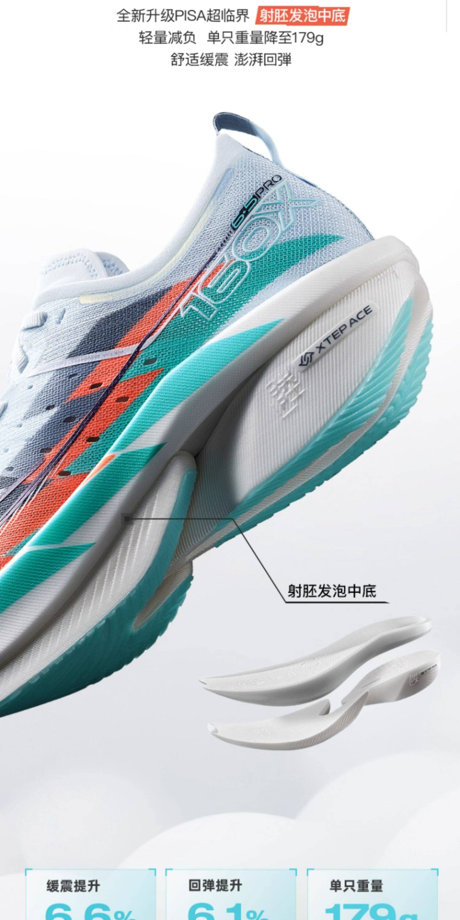 * XTEP ACE Midsole: Nitrogen-injected foam, 72%-88% rebound, dual-density design, <3% attenuation over 42km.